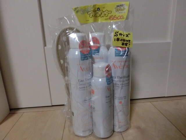 こんばんは。昨日買ったのは、アベンヌウォーターです。3本セットにスモールサイズがおまけで、なぜかルームサンダルまでおまけに付き、ポイントを使ってお得に買い物ができることもあり、買ってしまいました。値引き販売をしてしない商品なので、おまけ付きには弱いです。