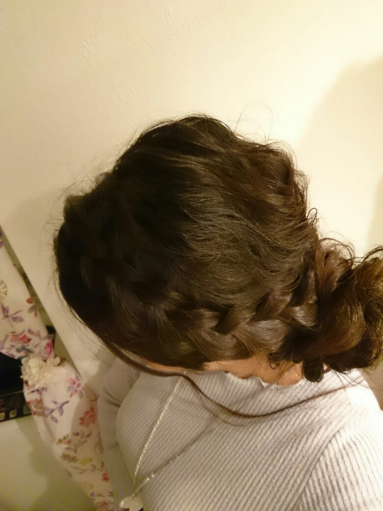髪を巻いてセンター部分をひとつにしてから、左右を編み込んでルーズに毛をほぐし、左下でまとめてトップはふわっとさせました。