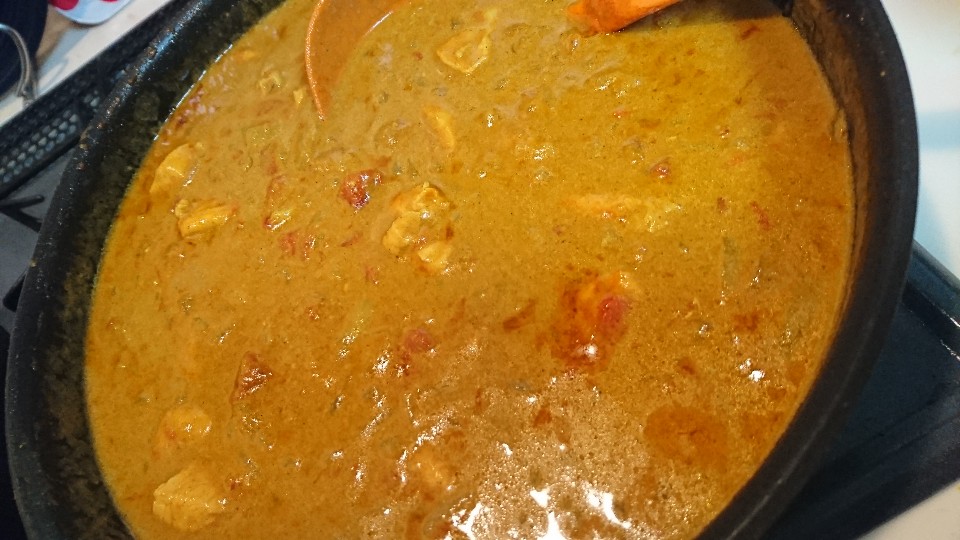 玉ねぎカットトマトココナッツミルク牛乳鶏ガラスープ三温糖シナモンパウダー…とごっそり投入してお玉でぐーるぐる。