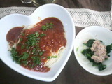 トマトチキンスープ、豚肉マスタードソース少し、ご飯少し、青汁