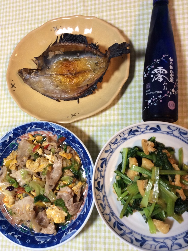 今晩の献立は 干し宗八かれい、レタスと豚肉の卵炒め、小松菜と油揚げの炒め物です。きのうのレタスサラダの残りが炒め物になりました。お酒はスパークリング清酒をいただきます。