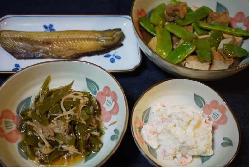 今晩のおつまみは 縞ほっけ一夜干し、厚揚げとささげの味噌炒め煮、ピーマンとえのきとナメタケの和え物、ポテトサラダです。久しぶりに ほっけを魚焼きロースターで焼きました。