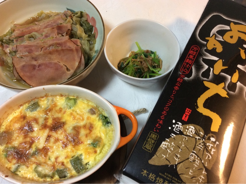 おつまみをつくりました。焼豚とレタスの重ね蒸し煮、ベーコン ほうれん草 オクラ しめじのキッシュ風、三つ葉となめ茸の和え物です。お酒は大好きな芋焼酎 です。市販の焼豚ハムがしょっぱかったのでのでレタスの消費を兼ねて蒸し煮にしてみました。