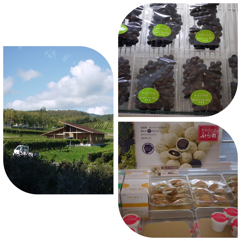富良野 カンパーナ六花亭でぶどうのお菓子とここで収穫されたぶどうを買いました。六花亭には 無料のコーヒーを飲みに寄ったのですが、ぶどう畑のぶどうが食べ頃で食べたいなぁと言っていたらお店で売っていました。採りたてのぶどうは490円でした。