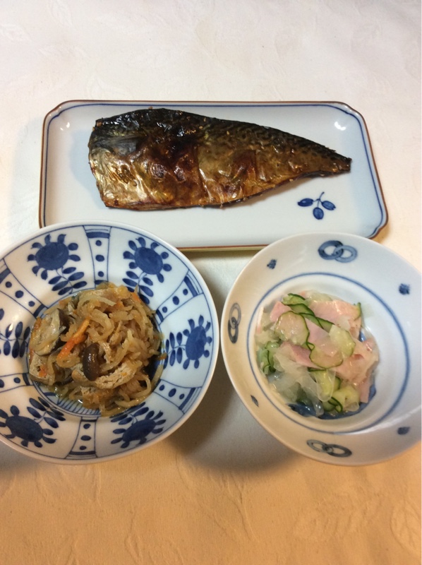 本日のおつまみ、白身魚のフライ、切り干し大根と切り昆布の煮物、キャベツたっぷり蟹缶のサラダ、筍と若布の煮物、胡瓜の古漬けミョウガ添え。