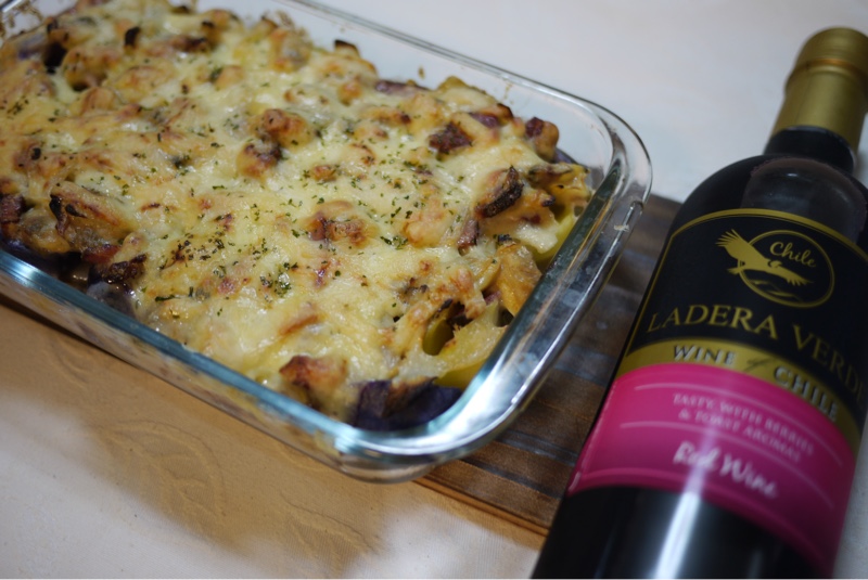 グラタンをつくりました。具材は あさり、ベーコン、紫ジャガイモです。ホワイトソースはクラムチャウダーのカップスープと牛乳を使いました。赤ワインは 安価なペットボトルでも美味しいチリ産ワインです。チーズ料理の時は赤ワインを飲みたくなります。