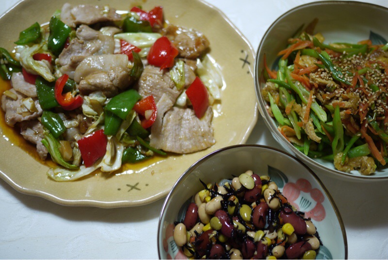 おつまみをつくりました。回鍋肉、ささげと人参と油揚げの炒め煮、ひじきと豆のサラダです。今週は1食置き換えスムージーを休んで晩酌タイムを楽しんでいますが、体重は増えていません。なので今晩も小さな居酒屋は開店しました。