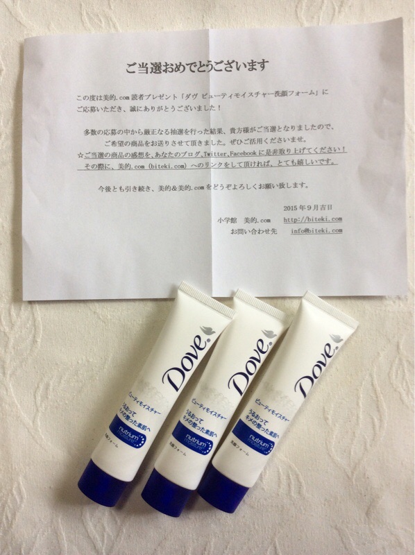 ダヴの洗顔フォームが当選しました。ミニサイズ20g3本です。集中うるおい美容液が配合の洗顔フォームです。ダヴの洗顔フォームは まだ未体験です。さっそく使ってみます。