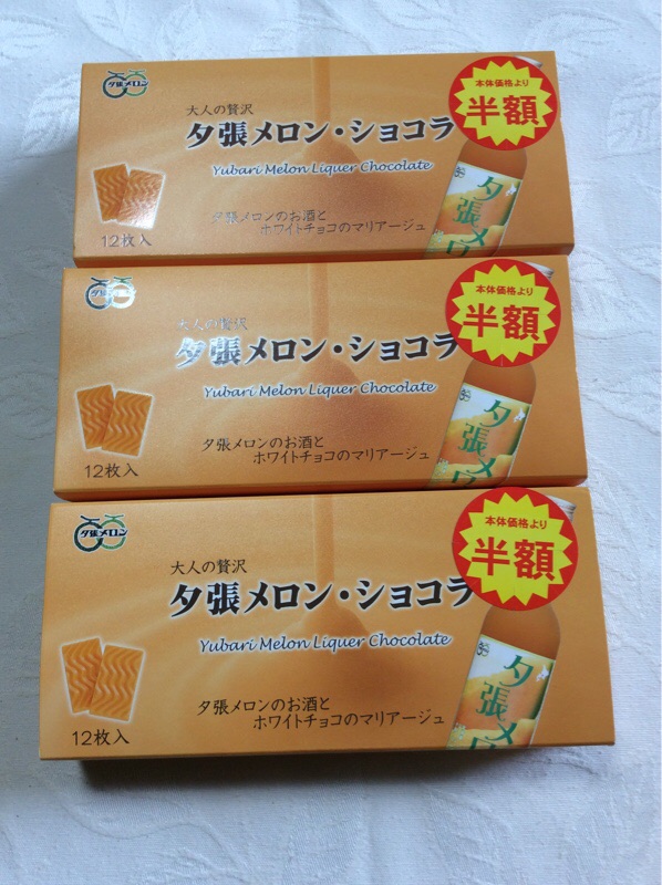 コスメを買ったあとデパ地下でお買得品を見つけました。半額なので3個買いました。函館でつくられたホワイトチョコで夕張メロンのリキュールが使われたチョコレートです。どんな味かしら?