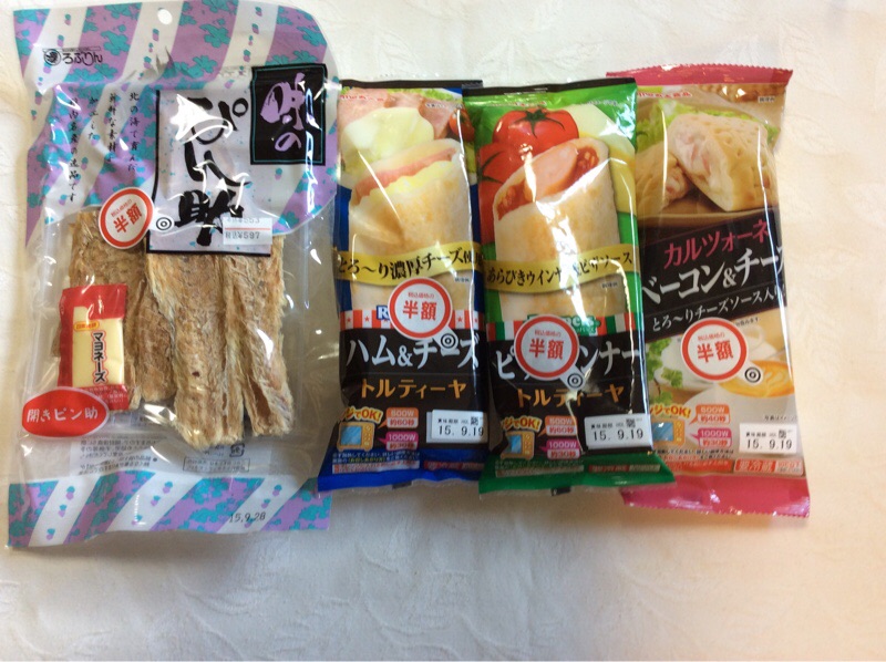 ウォーキングに行ってきました。今日もお天気で暑くなって長袖のブラウスを腕まくりして歩いてきました。帰りのスーパーで半額品を買ってきました。珍味とトルティーヤです。トルティーヤは主人の明日のお弁当にしようかなぁ・・・