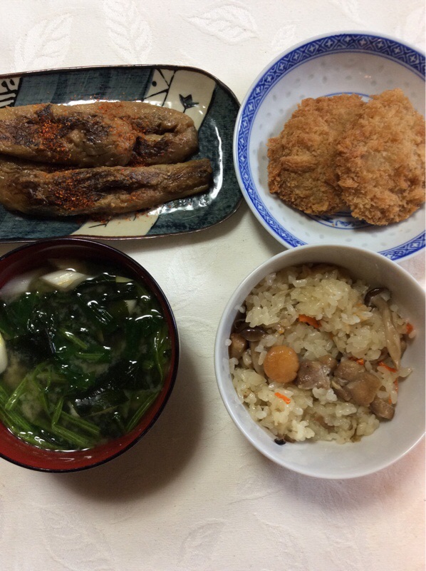 お昼ごはんは なすの味噌焼き、ミニひれかつ、帆立と鶏肉の炊き込みごはん、味噌汁です。昨日 母が主人に作ったお赤飯と炊き込みごはん、なす焼きをスーツケースで運びました。ごはん類だけで4圓任靴拭昨夜食べた主人はやっぱり私の実家で食べたかったなぁと言いました。残りは冷凍しました。