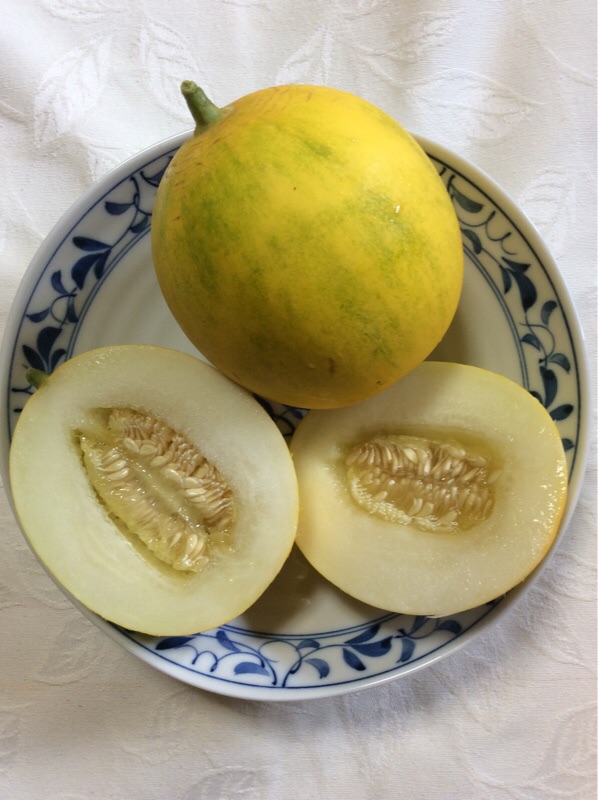 きのう 道の駅の産直で 初めてエリザベスメロンを購入しました。2個で150円でした。表面はきれいな黄色で果肉は真っ白です。ネットで調べると上品な香りと甘味、シャクシャクとした歯ざわりが特徴との事。さっそくいただいてみます。