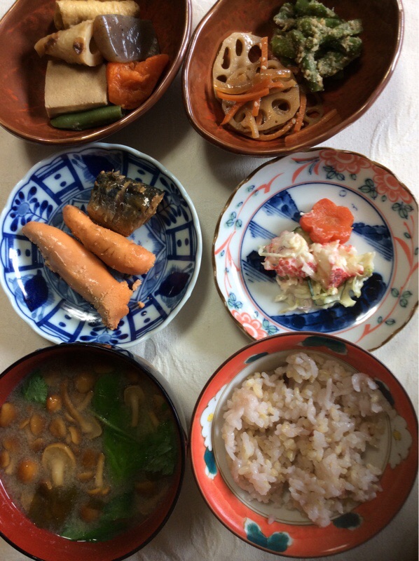 お昼ごはんは 煮物、煮魚、焼きたらこ、なめこの味噌汁、雑穀玄米ごはん100gです。いただきます。