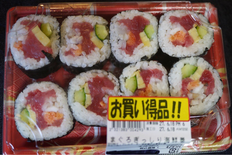 お昼ごはんに海鮮巻を買ってきました。1食置き換えスムージーダイエットは野菜不足よりタンパク質不足が気になります。海鮮巻のマグロとサーモンでタンパク質をいただきます。あとえのきと水菜とワカメの味噌汁をつくります。