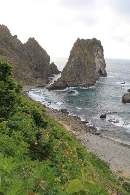 積丹半島の島武意(しまむい)海岸です。日本の渚百選に選ばれた海岸です。こちらもエゾカンゾウがたくさん咲いていました。