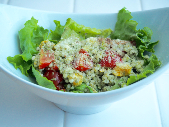 粒のホワイトソルガムで、ジェノベーゼソースのグレインサラダ♪