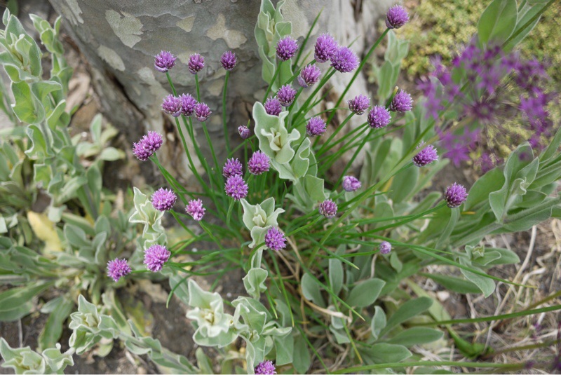 小さなネギ坊主ような花は チャイブ(西洋アサツキ、エゾネギ)です。西洋料理では 日本のネギのように扱われ 刻んで料理に振りかけて調味料やバターと混ぜてチャイブバターにします。食べてみたいと思いました。