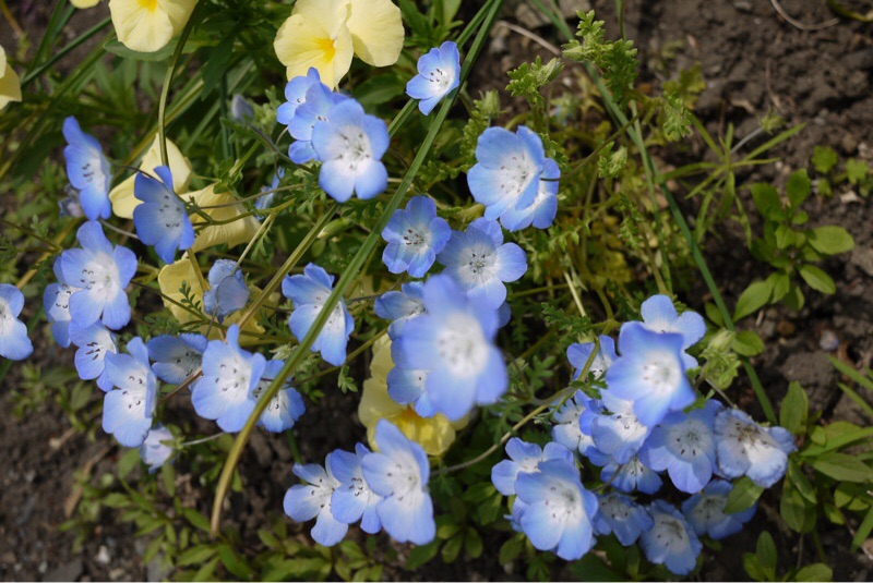 ブルーの花はネモフィラです。(瑠璃唐草、小紋唐草)です。ネモフィラの名前はギリシャ語の森と愛するが合わさった名前で森のそばに咲いていることが多いことからこの名前がつけられたそうです。茨城県の国営ひたち海浜公園のみはらしの丘でネモフィラ畑が見られます。一度行って見たいです。