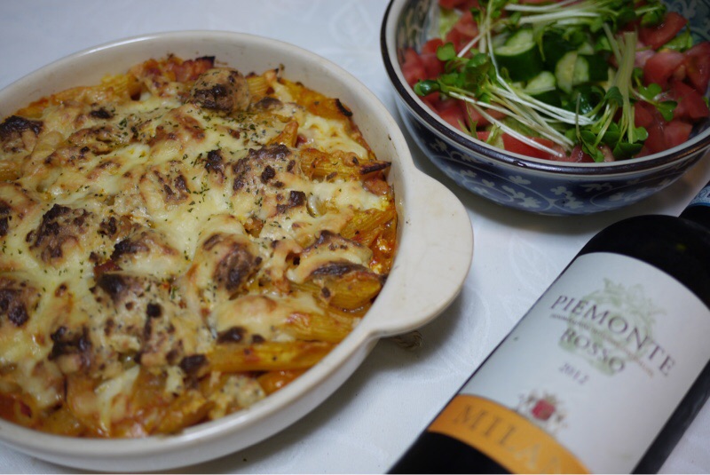 夕ご飯は トマトソースのベーコンペンネグラタン、サラダです。初めて買ったチーズでチャレンジしてみました。美味しくできたかな・・・