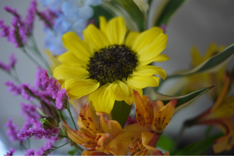 ウォーキングの帰り お花を買いました。札幌の気温は22℃ ボーダーの長袖のカットソーワンピースで暑く感じました。11000歩あるきました。