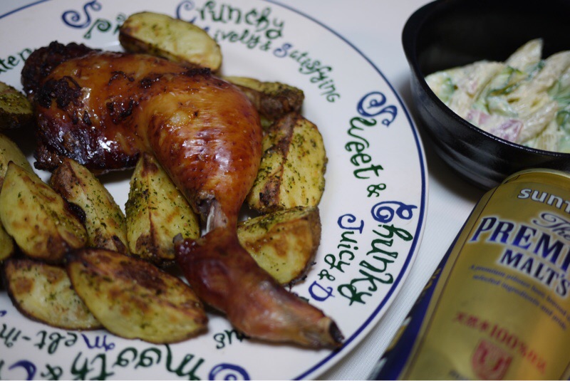 夕ご飯は ローストチキン、ベイクドポテト、マカロニサラダです。ポテトは十勝産のマチルダでキウイのような形の小ぶりなじゃがいもです。スーパーで男爵とメークイーンの中間の味わいと紹介されていました。お酒は サントリーのプレミアムモルツをいただきます。